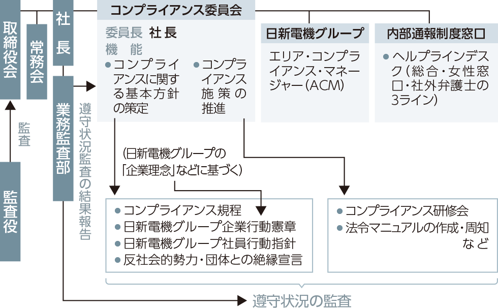 当社グループでは、「企業理念」・「行動の原点」・「事業の精神」に基づいて「日新電機グループ企業行動憲章」と「日新電機グループ社員行動指針」を定め、国内だけでなく各国言語に翻訳して冊子で配布するなど、国内外グループ社員への周知を図っています。また、コンプライアンスの一層の徹底のための施策や教育・啓発活動を「コンプライアンス委員会」が各職場・グループ会社の「エリア・コンプライアンス・マネージャー」と連携して推進しています。