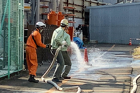 事業所ごとに自衛消防隊を組織し、消防署のご指導・ご協力のもと、定期的な防火・防災訓練を行っています。