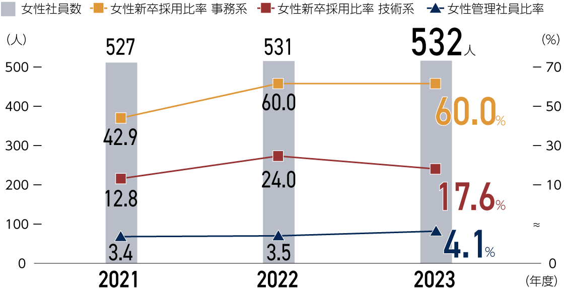 女性の積極採用・登用・育成や、キャリア採用を積極的に実施し、また、海外グループ会社では、役員や幹部社員に現地採用社員の登用を推進しています。