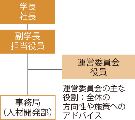 社長が学長、人材開発部が事務局を務め、役員がアドバイザーとなって、「自己研鑽のための教育・研修」「職場教育(OJT)」「ジョブローテーション」の三位一体の人材育成体制で推進しており、職位や仕事レベルに応じて求められる知識や考え方を身に付けられるよう、階層別の教育を中心に、受講を必須化しています。