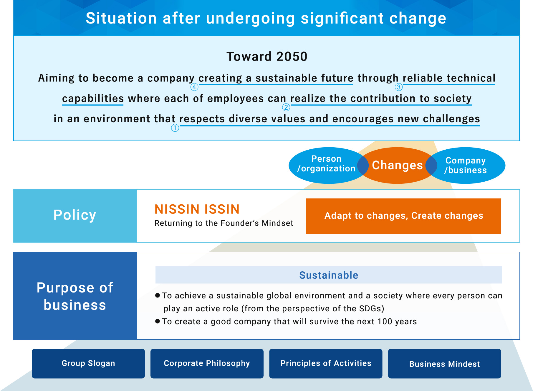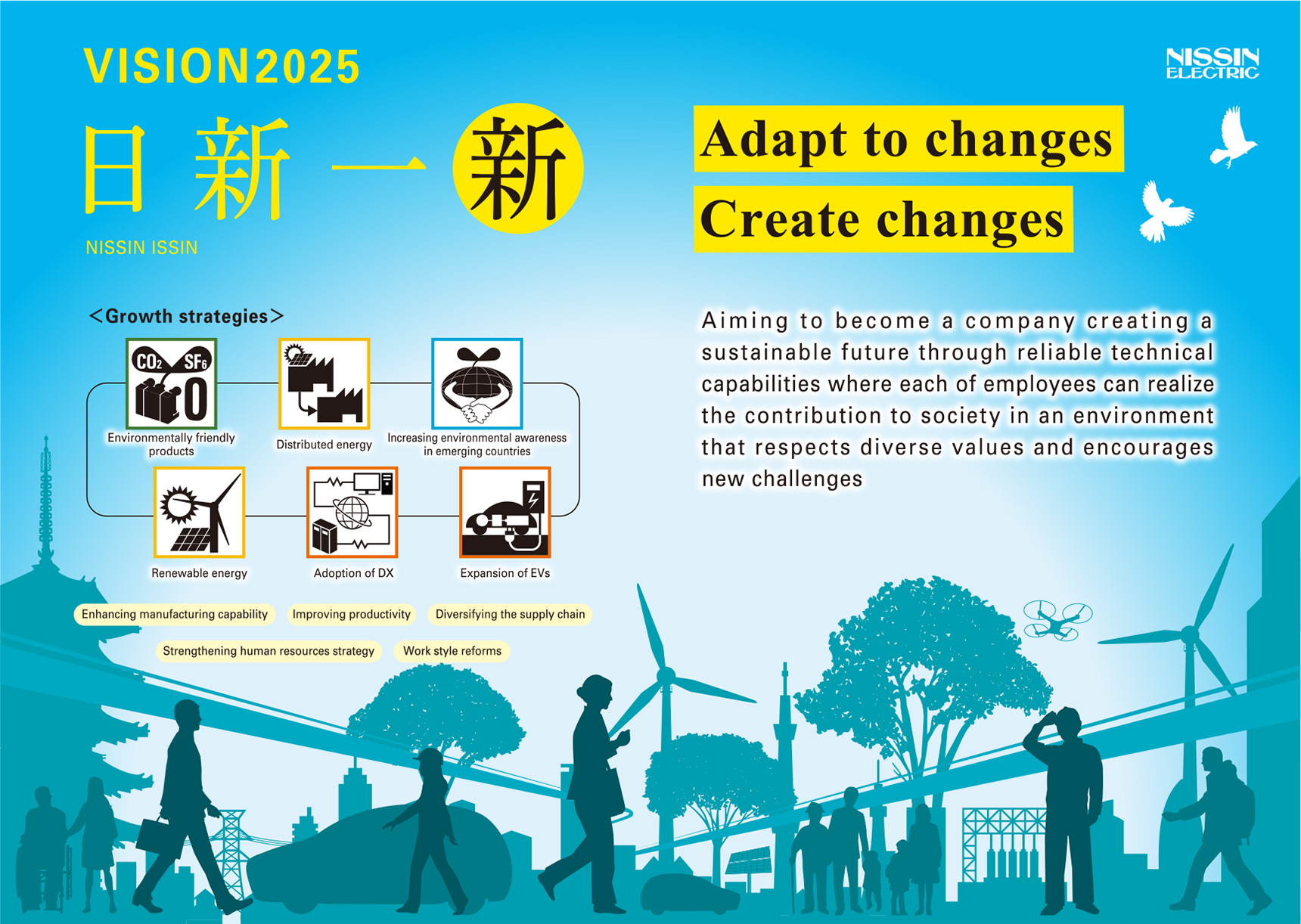 In the new Medium-to-Long-Term Business Plan “VISION2025,” which started in April 2021, the company will work to change its people, organizations and businesses under the slogan of NISSIN ISSIN* for transforming into a corporate group “Aiming to become a company creating a sustainable future through reliable technical capabilities where each of employees can realize the contribution to society in an environment that respects diverse values and encourages new challenges.”