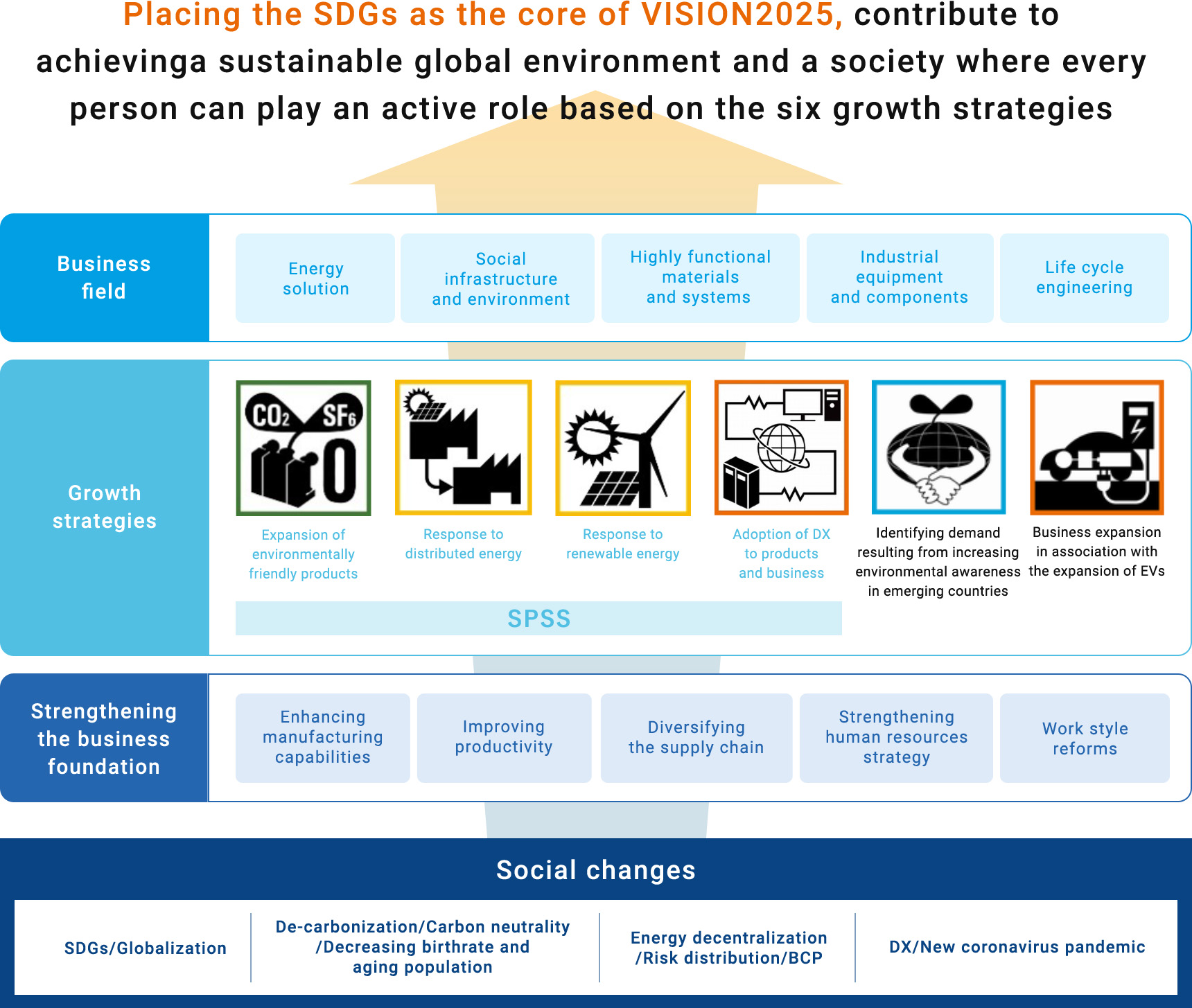 Seeing various social changes, including the use of distributed energy resources with the advent of a decarbonized society and the spread use of renewable energy and diversification of workstyles due to an aging society with a declining birthrate in Japan and the new coronavirus pandemic, as business opportunities, Nissin Electric will work to implement the following growth strategies placing the SDGs at their core, and strengthen the business foundation that supports them, and positively make investments for growth from fiscal 2026, thereby contributing to achieving a sustainable global environment and a society where every person can play an active role.