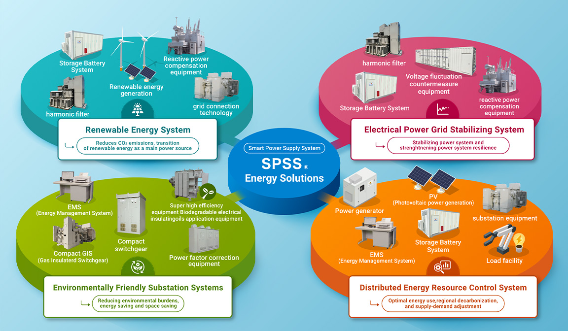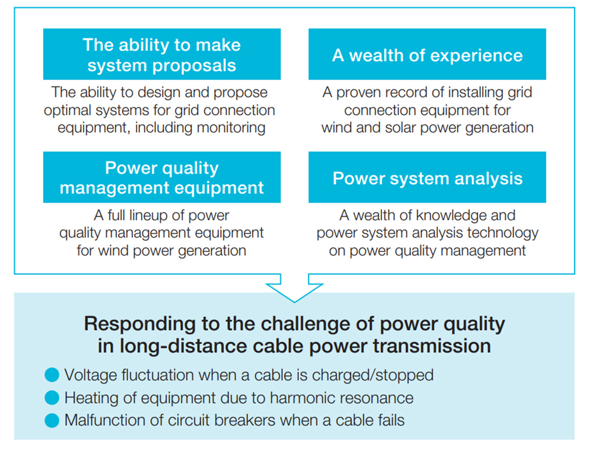 Nissin Electric's power system analysis engineering based on our reactive power compensation equipment technology is actively used in providing power quality management for grid interconnection of renewable energy sources. Provision of power quality management is a challenge faced in the utilization of renewable energy. We provide comprehensive support, from finding problems to working out solutions based on grid interconnection.