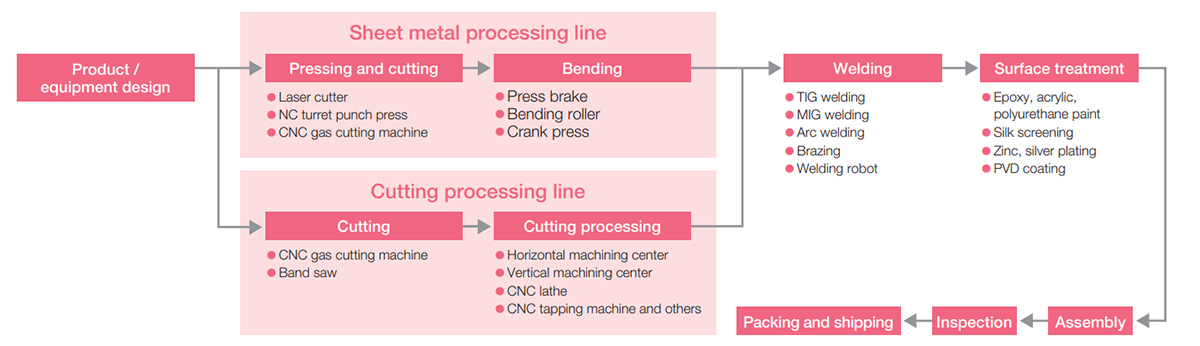 The company offers commissioned services such as cutting, sheet metal working, welding, and surface treatment, leveraging its long-fostered technical capabilities and expertise in the manufacture of power system equipment. It also makes proposals for optimizing design and processing tailored to customers' specific requests, in addition to providing commissioned production services delivering their equipment and parts.