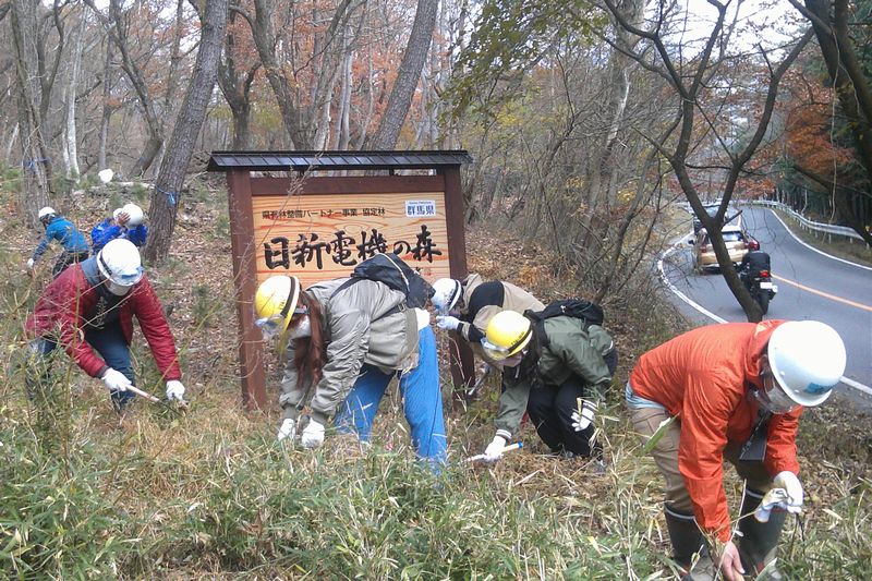 日新電機の事業所がある群馬県前橋市においても、翌2019年に地元自治体との赤城山の森林整備に関する協定を締結し、助成と保全活動を行っています。京都府、群馬県それぞれ「日新電機の森」と名付け、社員とその家族がボランティアとして植栽や下草刈り、遊歩道づくりや展望台の修復作業などを、地元の方々と一緒に行っています。