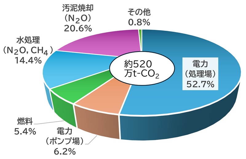 日本では、2030年までに温室効果ガス排出量を2013年度比で46%削減し、2050年までにカーボンニュートラルを達成するという目標を掲げています。2021年度の下水道施設からの温室効果ガスの発生量は約520万トンであり、これは日本の温室効果ガス排出・吸収量の約0.5%に相当します。また、自治体の事務事業における温室効果ガス排出量のうち、下水処理が占める割合は大きく、自治体が排出量削減の目標を達成するためには、下水処理施設のカーボンニュートラル化が不可欠です。